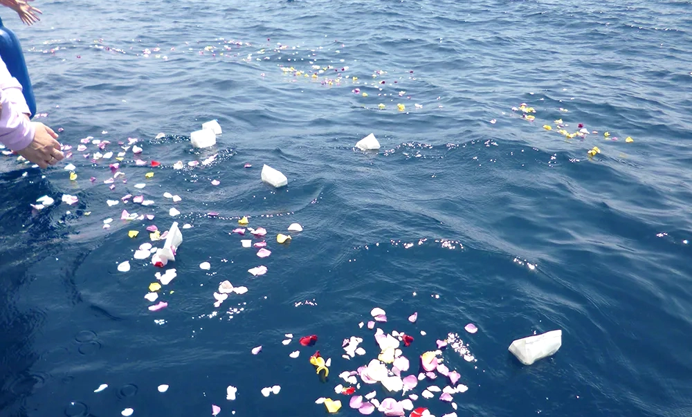 船の上から骨を海に撒き海上で最後のお別れの儀式を行います。